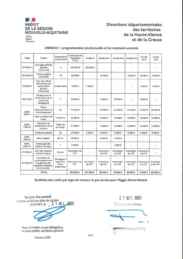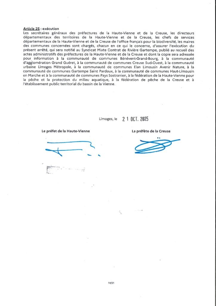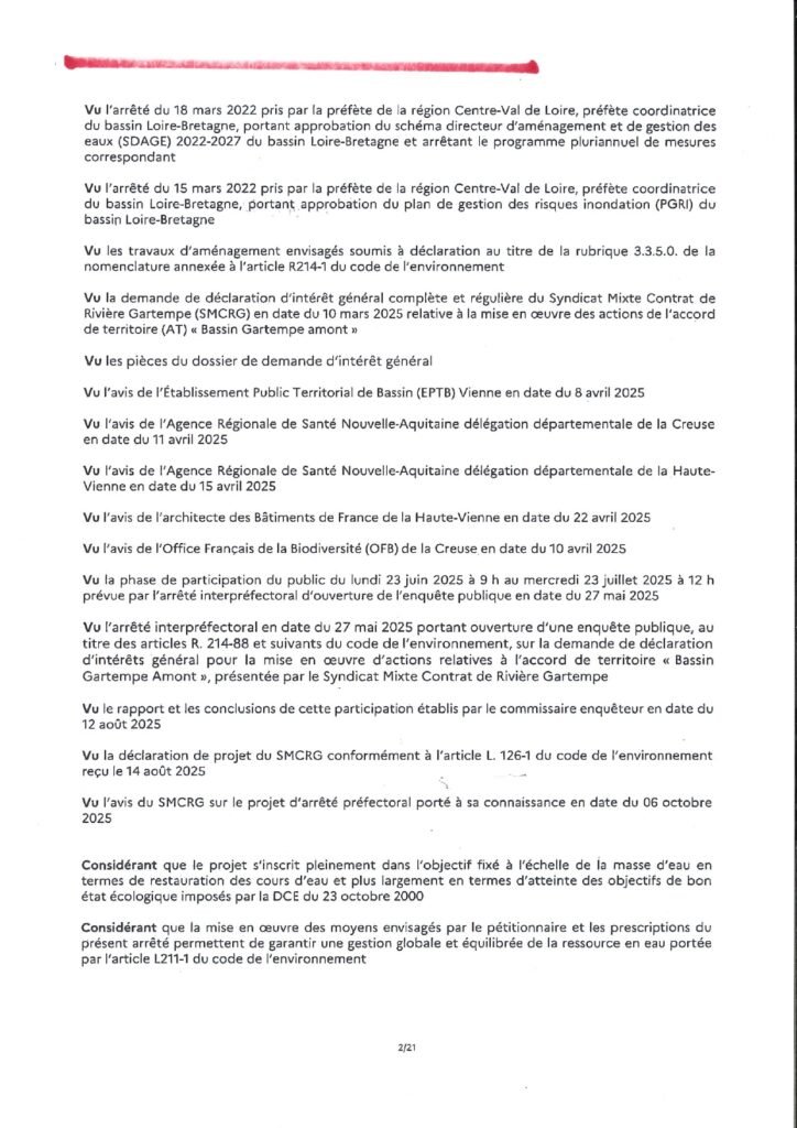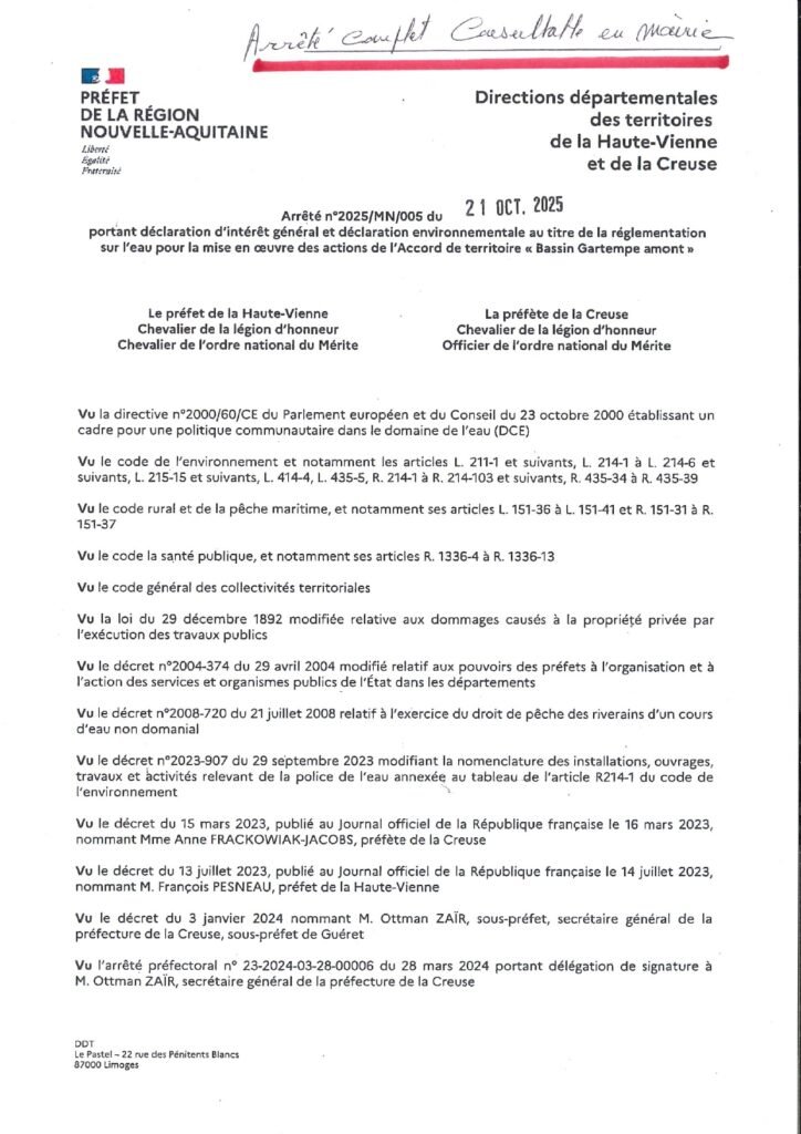 Arrêté préfectoral n°2025/MN/005 du 21 octobre 2025 portant déclaration d’intérêt général et la déclaration environnementale au titre de la réglementation sur l’eau pour la mise en oeuvre des actions de l’Accord de territoire « Bassin Gartempe amont »